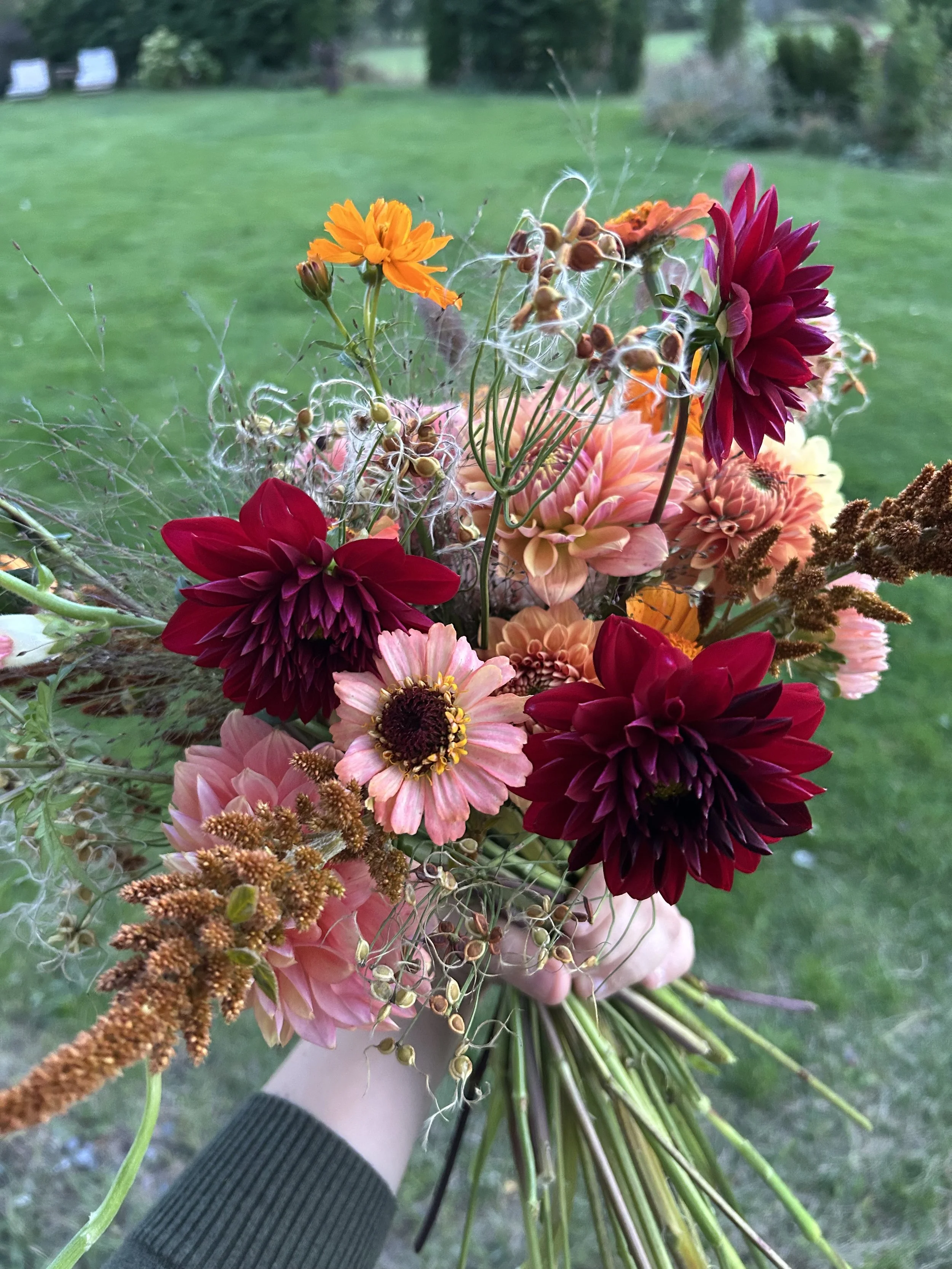 När jag både odlar och arrangerar får jag följa blommorna från frö till fest. Det gör att varje arrangemang skapas med en omsorg som märks – i färgerna, i formerna och i känslan de förmedlar.