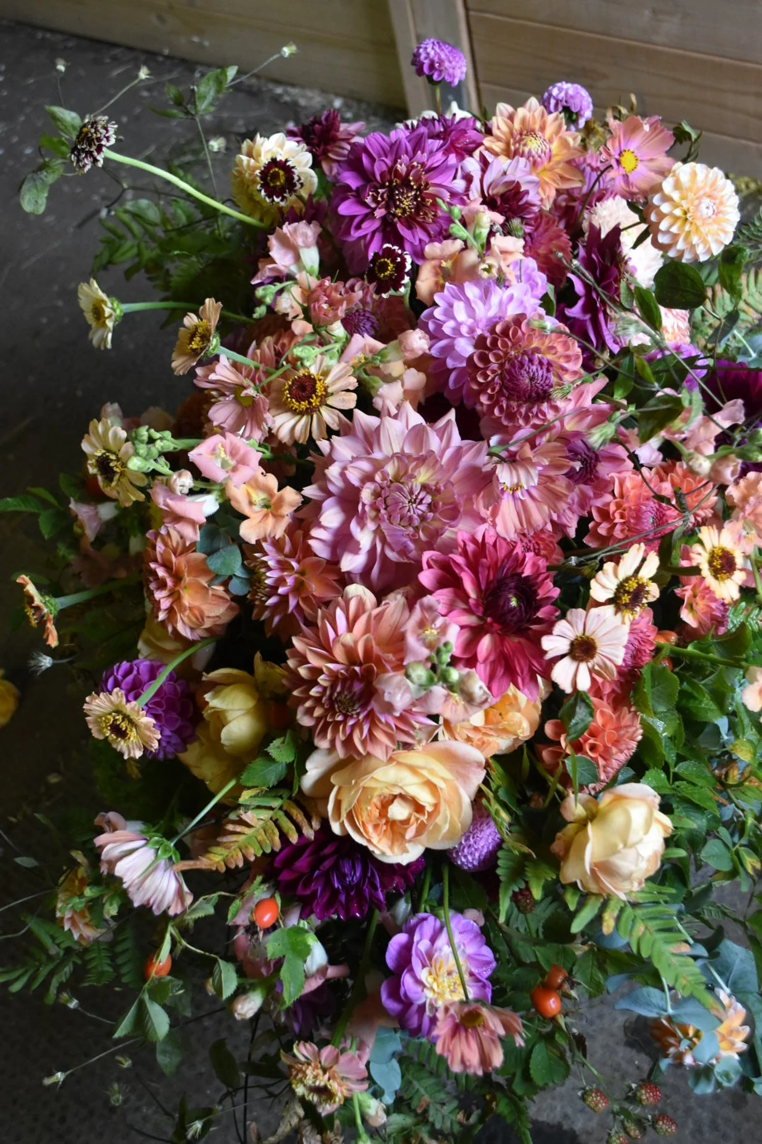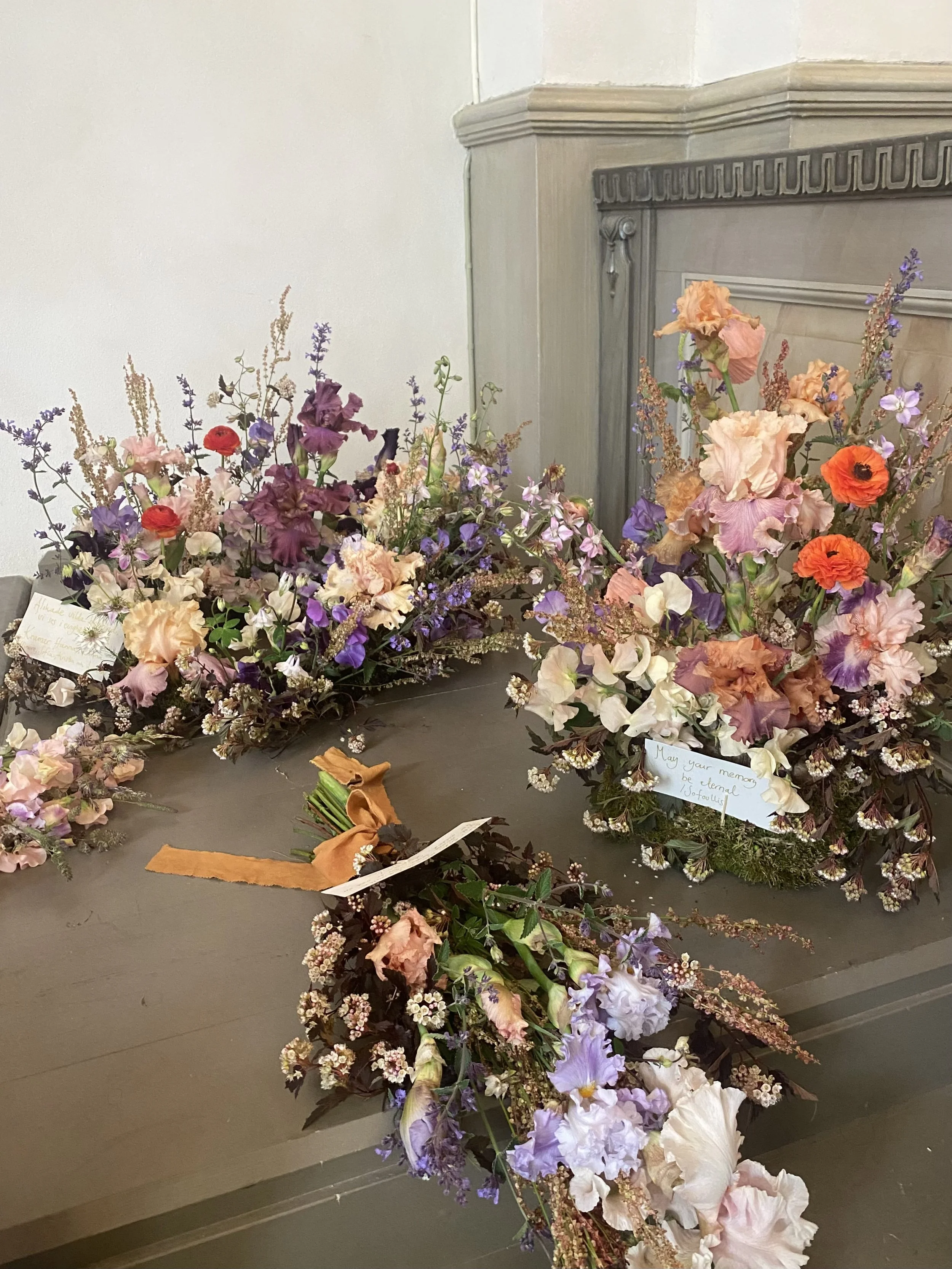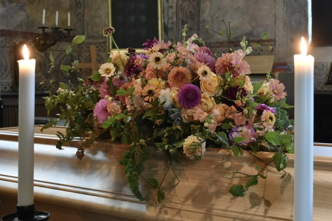 Jag arbetar med blommor som vuxit här, i vår egen jord och i takt med årstidens rytm. Det gör att varje arrangemang får en naturlig mjukhet och ett uttryck som känns äkta. Färgerna, formerna och dofterna speglar den tid på året då avskedet sker, och skapar en stillsam harmoni som många upplever som tröstande.